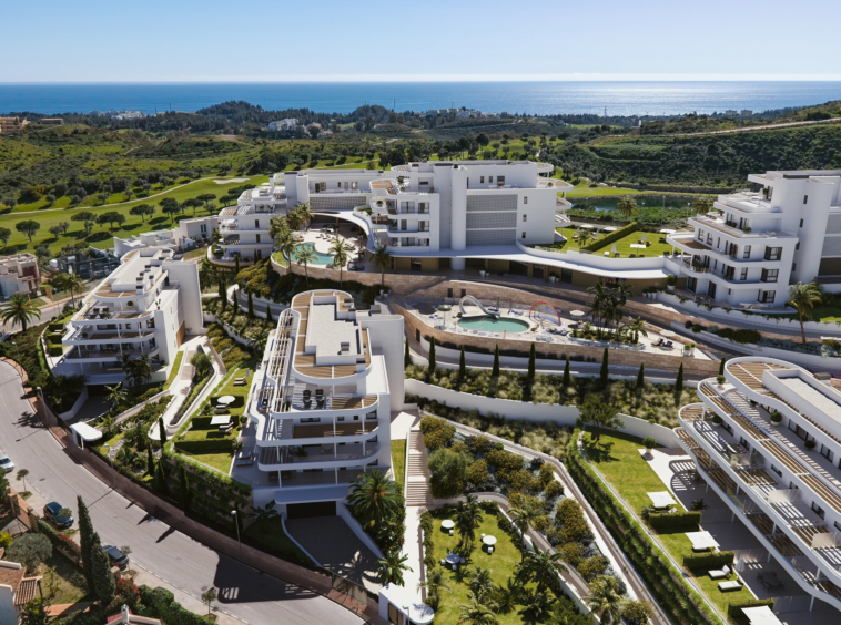 New building project 360 by Cordia in Mijas Costa, nestled on an elevated plot overlooking the Cerrado del Águila Golf Club and offering more than 180° panoramic views over the Mediterranean Sea, the golf course and the surrounding hills.